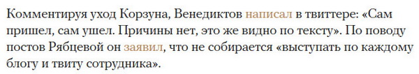 PS: особую прелесть ситуации придаёт тот факт, что всего полгода назад тот же Венедиктов, а вместе с ним и вся общественность, боролись против увольнения Плющева. Тоже за не понравившуюся кому-то запись в блоге. Было бы странно, сначала хвалить Венедиктова за то что он не прогнулся под Лесина, а через полгода ругать за то что не прогнулся под Корзуна.
