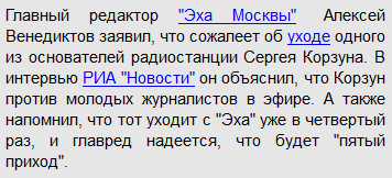 Жаль. Эфиры Корзуна я всегда слушал с большим удовольствием. По-моему, он один из лучших интервьюеров в России и уж точно лучший на Эхе.