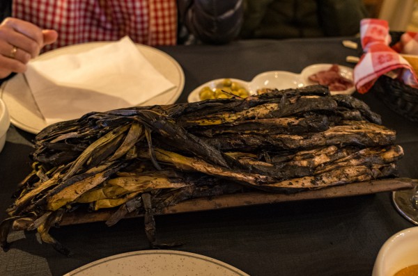 Ну и за два часа до возвращения домой в ресторанчике Les Espelmes, который стоит на холме недалеко от Таррагоны, отведали кальсотс (я писал о том, что это за блюдо) - воздали дань местной традиции. Очень вкусная штука, несмотря на невзрачный вид. Но там просто снимаешь как перчатку верхний обгорелый слой (кальсот жарят на сухой виноградной лозе), а под ним - нежнейшая белая сердцевина кальсота, которую нужно макать в соус ромеско и поедать, урча от наслаждения.