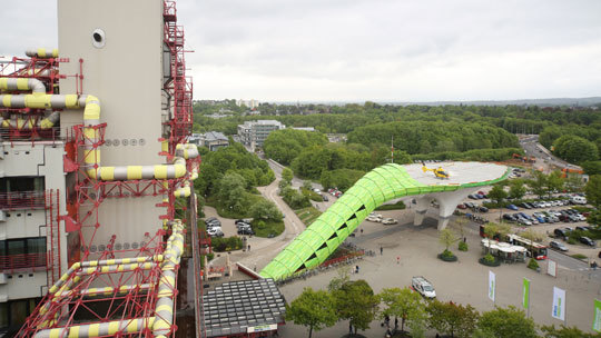 А у нас в Ахене лет девять как пристроили к зданию Клиникума пристроили вертолётную площадку. Официально она должна символизировать длань спасающую (нет, честное слово, Rettende Hand), но народ именует её не иначе как "Голова динозавра" или "Змеиная голова".