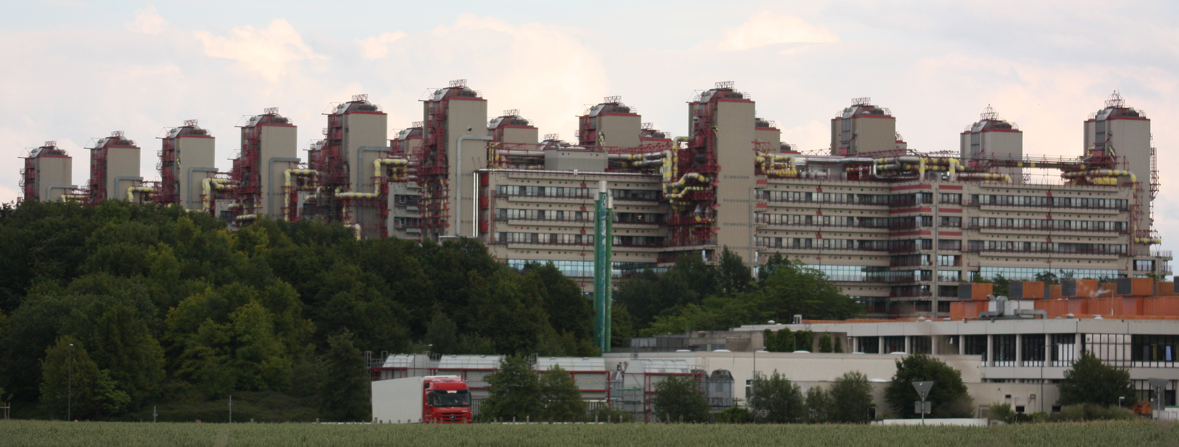 Нет, это и в самом деле воздуховоды. Тут история довольно забавная. Сначала на постройку Клиникума было выделено полмиллиарда марок, а здание планировалось десятиэтажным и облицованным зеркальным стеклом. Но строительство длилось так долго, столкнулось с таким количеством трудностей и проблем (мой хороший друг шутил, что архитектором был итальянец Нерассчиталли), что бюджет вырос вчетверо! В общем, когда сумма вышла за два миллиарда, было сказано: "Стоп. Строительство окончено. Не хватает двух этажей, хотя лифтовые шахты для них уже есть? Плевать. Система воздуховодов остаётся на виду? Ну и хрен с ней. Строительство окончено, денег больше нет." Вот и получилось то, что на фото - у жителей Ахена это любимая шутка, спросить у гостей города, что это за суровое здание. Угадавших если и было несколько человек, то я о таких не слышал. Впрочем, лет десять назад денег всё же подкинули - как раз на вертолётную площадку. Кстати, там внутри "шеи" широченный эскалатор без ступенек и отдельно лифт.