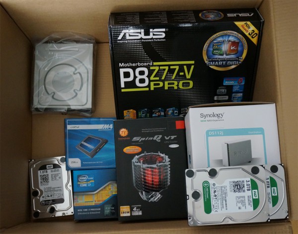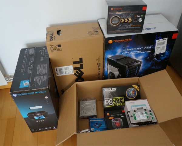 Вот оно, стоит в углу, дожидается дебоксации и сборки. Корпус, блок питания, монитор, принтер, мамаша, проц, кулер, SSD, винт, память (ее не видно), DVD (чуть не забыл заказать). Клаву-мышь не заказывал, они у меня свои, привезенные (тут нужную клаву не купить), видеокарту тоже не стал заказывать: я, судя по всему, вполне обойдусь встроенной в мамашу (точнее, в процессор), мне ж в игрушки не играть. Ну и заказал второй NAS: я один такой же покупал осенью, очень понравился. Думал взять новый на 4 диска, пространства теперь требуется намного больше, но решил, что проще оставить старый и взять еще новый под видеоколлекцию (чтобы с 3 этажа транслировать на телевизор на 1-м) - с двумя дисками по 3 Тб.
