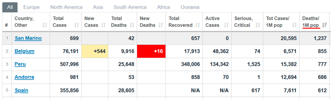 Другое дело, что по избыточной смертности с марта по начало июня в Бельгии 9000, а в Испании 48500. Так что похоже в Бельгии намного честнее считали. Если брать избыточную смертность, то да, Испания Бельгию обогнала.