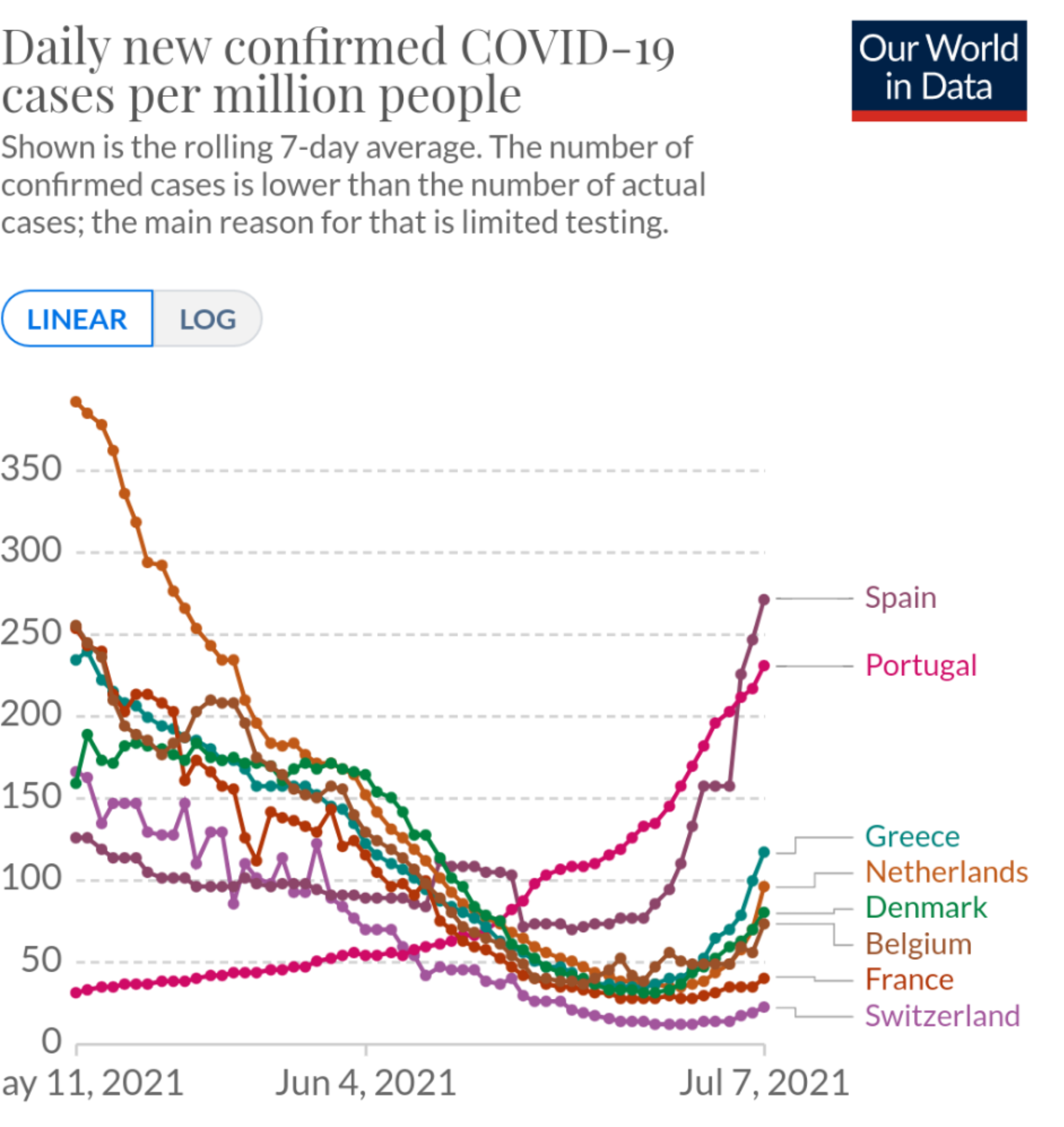 В Испании идет довольно резкий рост количества выявленных носителей (за несколько недель средняя выявляемость в Испании увеличилась на 137%, достигнув 252 случаев на 100 000 жителей.), и уже говорят о "пятой волне", причем всякие группы экспертов, как обычно, строят пугающие графики и бомбардируют правительство предложениями снова ввести комендантский час и снова заставить всех сидеть дома и не рыпаться, однако в правительстве - по крайней мере, пока - ведут себя вполне разумно - "Sanidad descarta el toque de queda a pesar del incremento de los contagios entre los jóvenes".