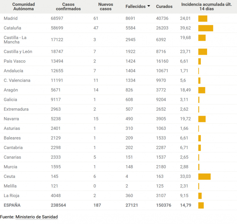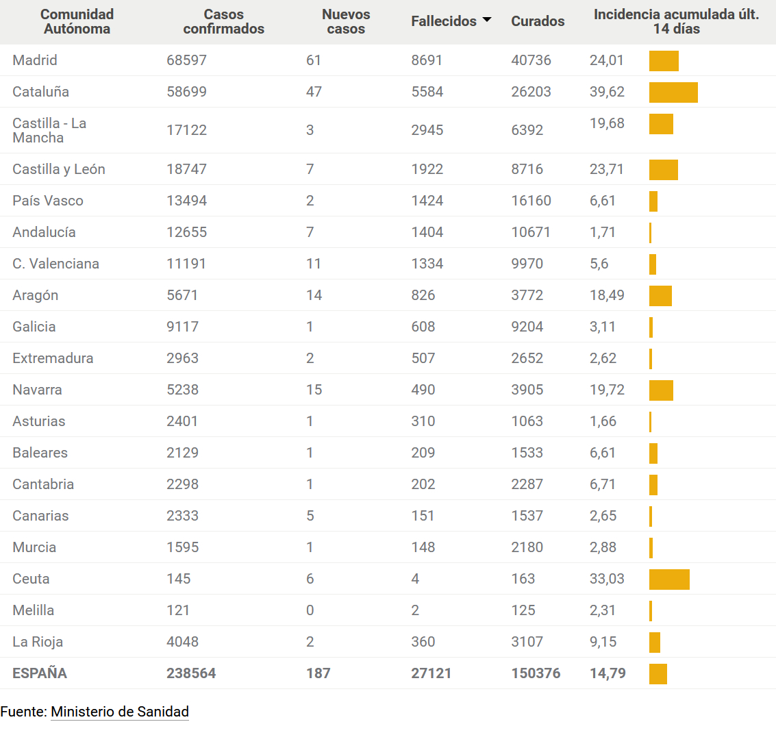 За вчера по Испании на 47 миллионов населения было 187 новых случаев. Хотя в очень многих санитарных зонах введен 2-й уровень выхода, а где-то даже и 3-й. Менее 100 случаев за день официально считается концом эпидемии.