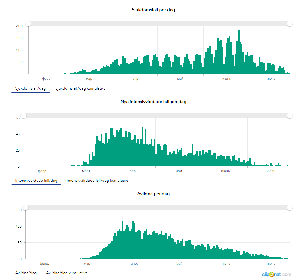 В результате имеем плавное постоянное снижение заболеваемости, и по количеству смертей картина примерно в два раза лучше любимой всеми Швеции.