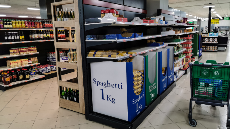 Макароны тоже разобрали, но остались спагетти - там был большой запас. Здоровенные упаковки с консервами стоят наполовину пустые, но еще не все выгребли.