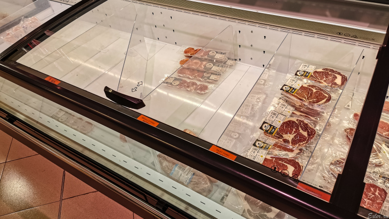 Заморозку разобрали всю - и мясную, и морепродукты. (Обычно ее очень редко кто покупает, только бедные семьи.) Из мясной заморозки остались только дорогие стейки.