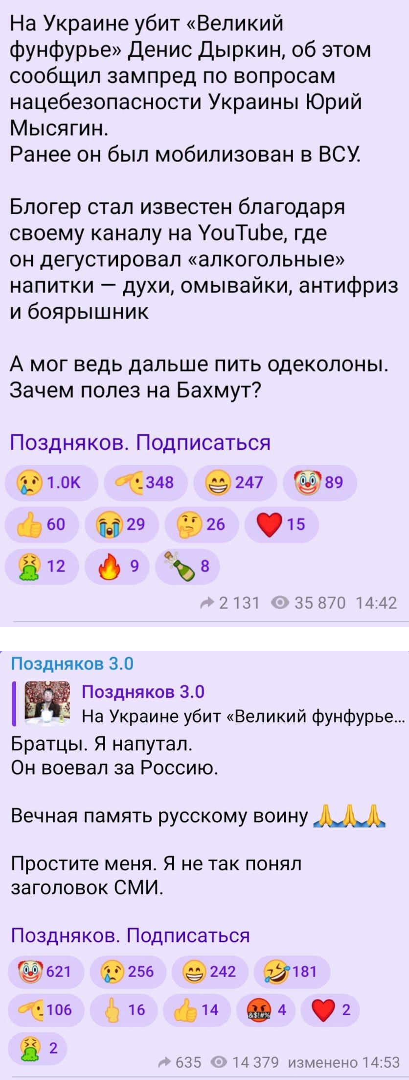 Он, кстати, по ряду сообщений, ходил освобождать Украину от украинцев, отчего и помер. Интересно, что вата не сразу разобралась, за кого он был, поэтому сначала начала плевать, а потом облизывать.