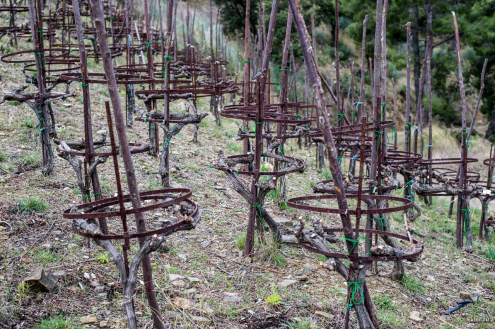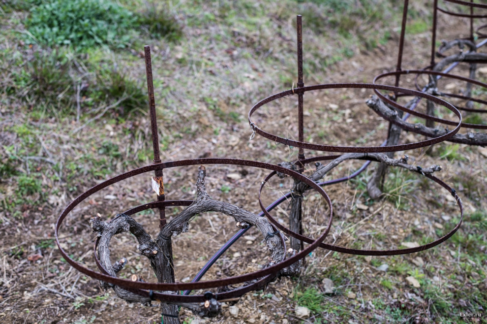 Где-то в середине подъема начались виноградники хозяйства Mas Martinet. Места на холмах - мало, а солнца - много. Так что тут лоза выращивается вокруг железной конструкции из двух колец, одно из которых поднимается по направляющей вверх где-то сантиметров на 70. Когда лоза вырастает, она кольцеобразно оплетает эту конструкцию, и тогда на террасах появляются эдакие ровные цилиндры. Подобный способ позволяет значительно уплотнить посадки, но при этом сохраняется требуемая площадь листового покрова, которая в то же время должным образом получает свою порцию солнечных лучей.