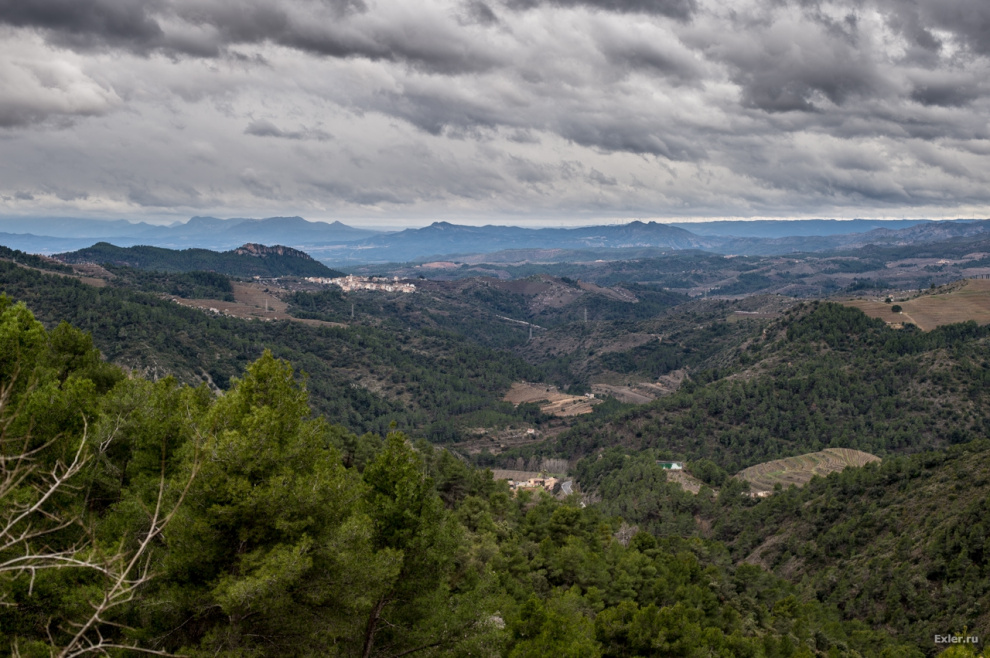 Наконец добрались до самого верха холма, откуда открывался чудесный вид на долину. Причем там было очень ветрено и пасмурно, и облака хорошо подчеркивали суровость условий, в которых приходится работать виноделам Приората.