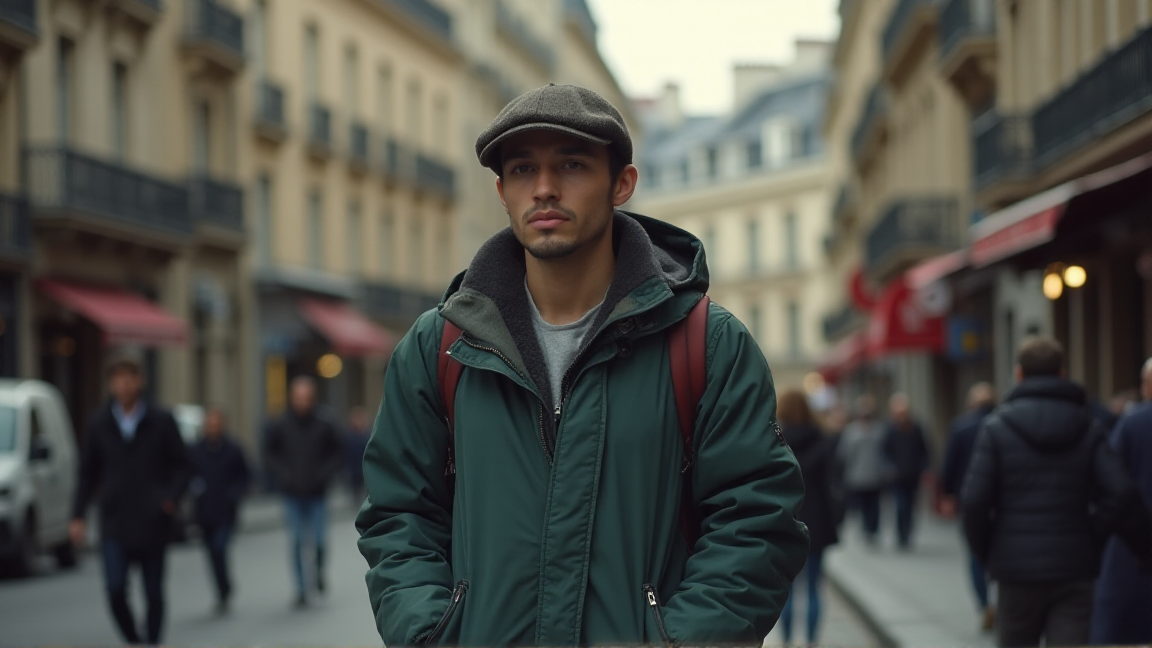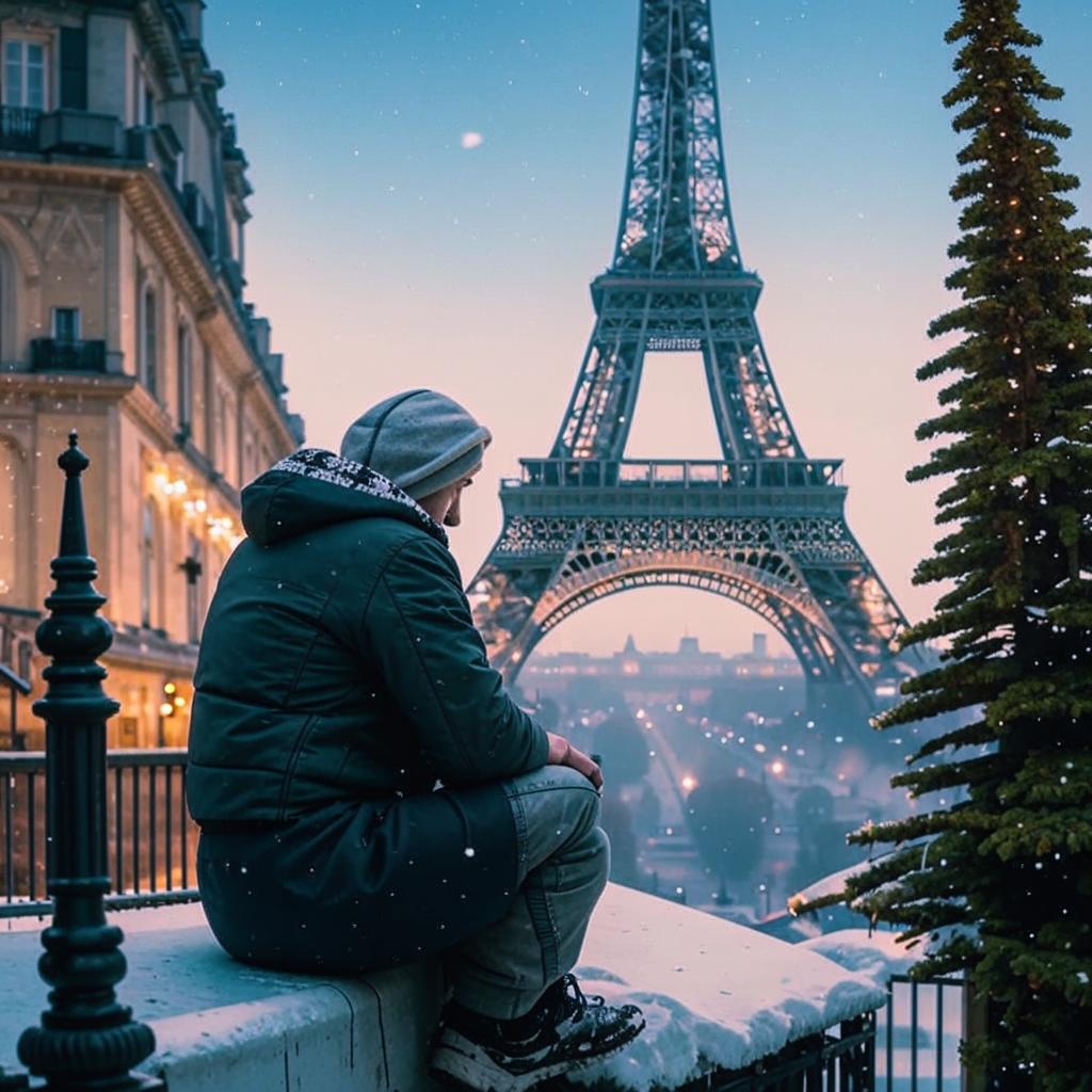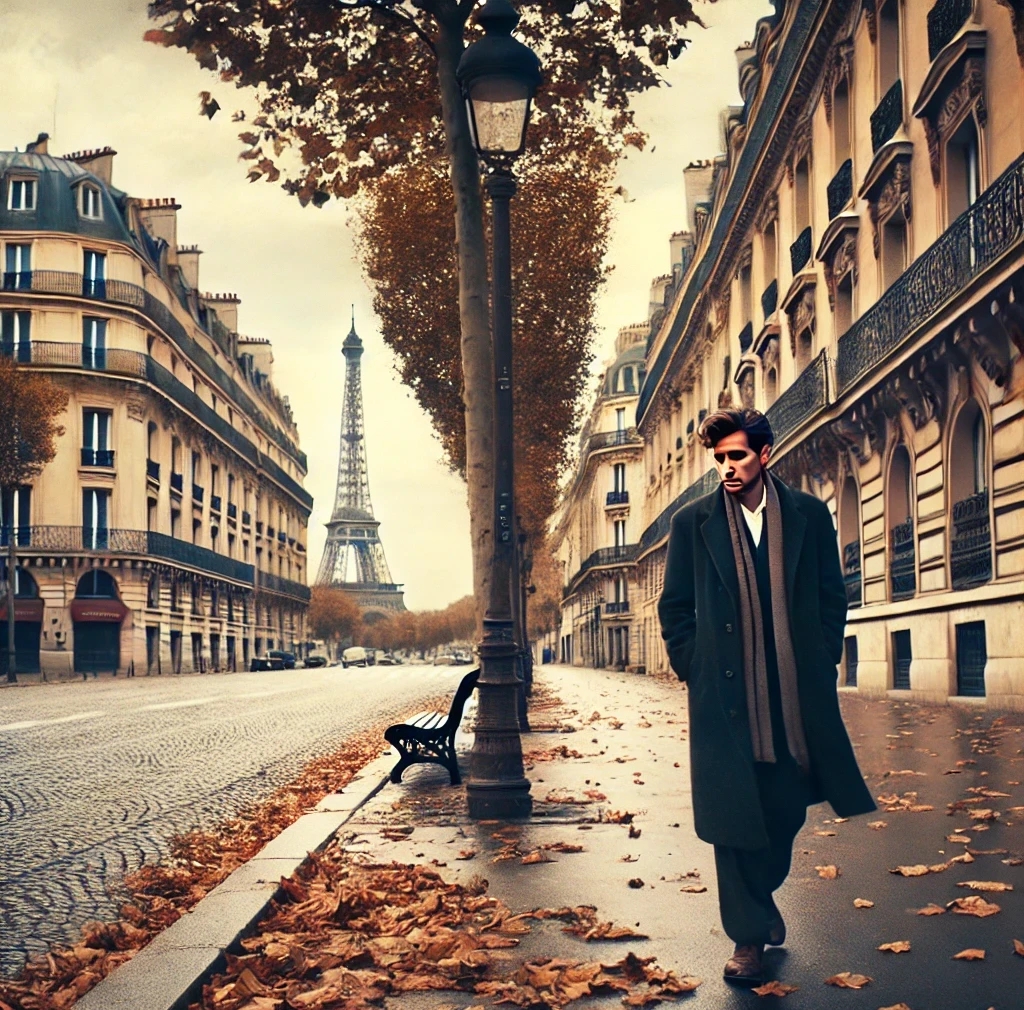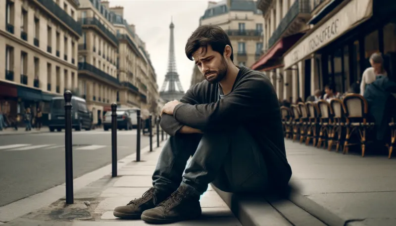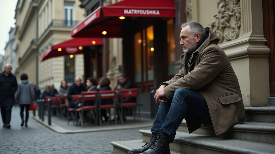 A lonely Russian relocante on the streets of Paris is sad about his homeland. He sits on a stairs below some church. There is a cafe "MATRYOUSHKA" visible in a background.