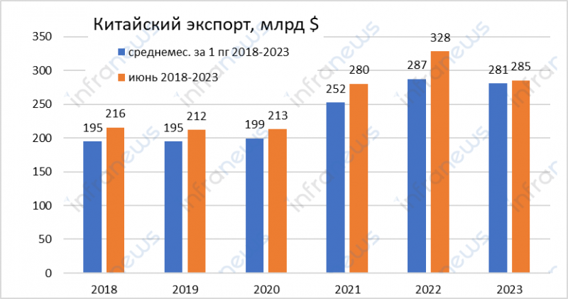 В июне китайский экспорт в долларовом выражении составил 285,32 млрд долларов США – это примерно на 12,5% меньше, чем годом ранее. Как отметили большинство международных СМИ, это падение стало самым сильным за период с февраля 2020 года, т.е. с начала пандемии.