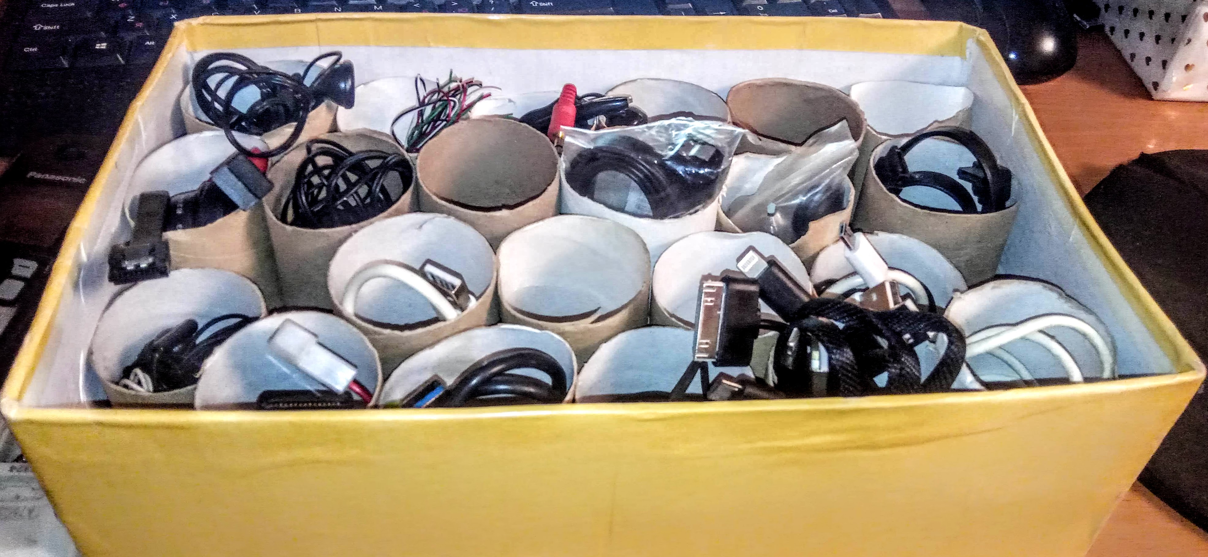 гениально, шеф!!! я картонки от полотенец использую нерезанные для сетевых (и 220 и эзернет) и видео (ВЖА и ХДМИ) кабелей а так же их обрезков, на картонке надписываю где какая дина. а для коротких проводов отлично подходят картонки от туалетной бумаги, может они и в коробку встанут по высоте?