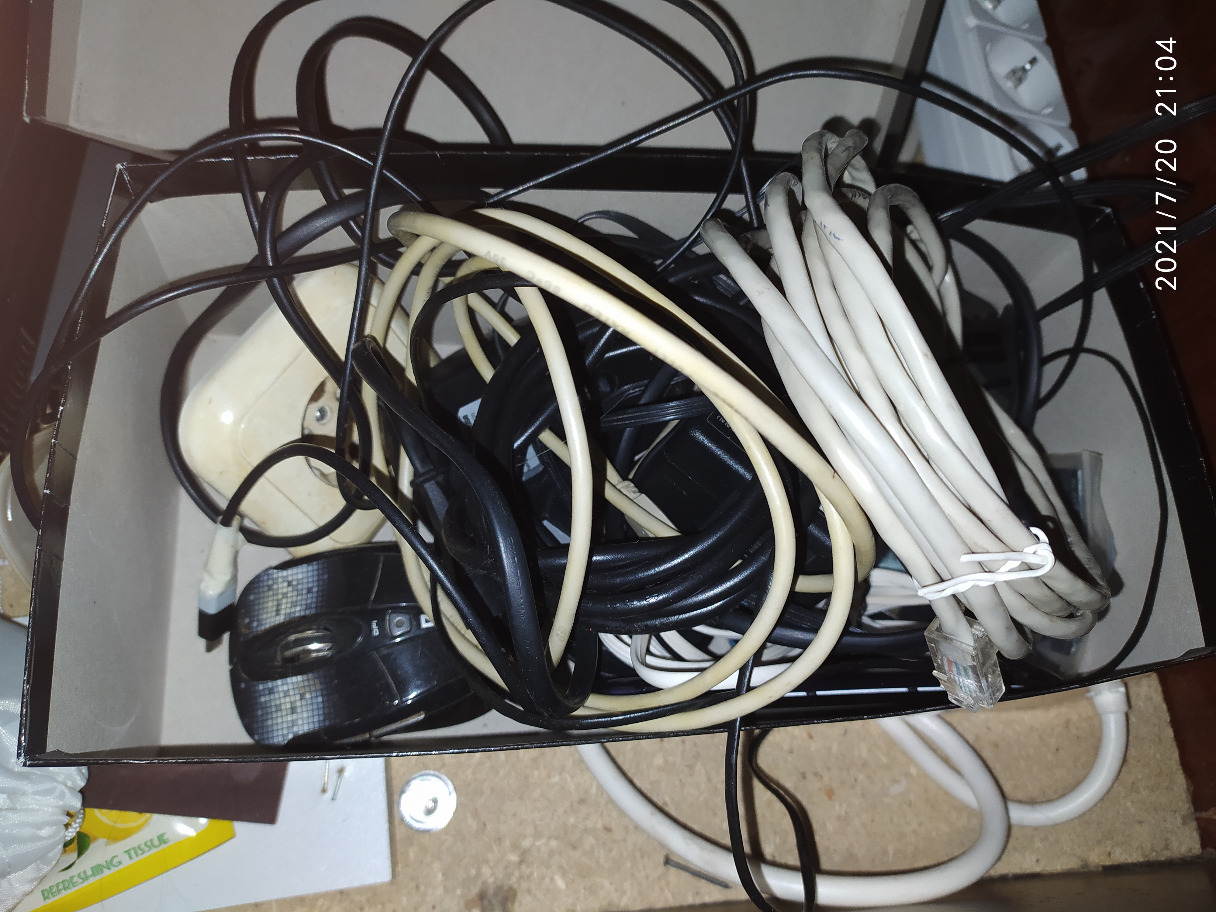 Даже стало интересно, что у меня по проводкам в ящике. Все более или менее прилично, неработающие кабеля, как правило, выбрасываю, не жалея, потому что к каждому гаджету новый же всегда прилагается. Правда со смартфонами это не всегда работает, какие-то клеммы уже, какие-то шире, но в целом, можно подобрать. С компьютерными проводами еще проще, самый ходовой - RJ45, его менять только, если переставляешь технику в другое место и не хватает длины, как случилось у меня в прошлом месяце. Жена снова переставляла мебель, поэтому ее компьютер переехал месте со столом на новое место, по итогу не хватало целых пять метров RJ45, у меня был второй, но тоже короткий, не хотелось морочится переходниками, поэтому попросту купил новый. Теперь имею кабеля трех длин)