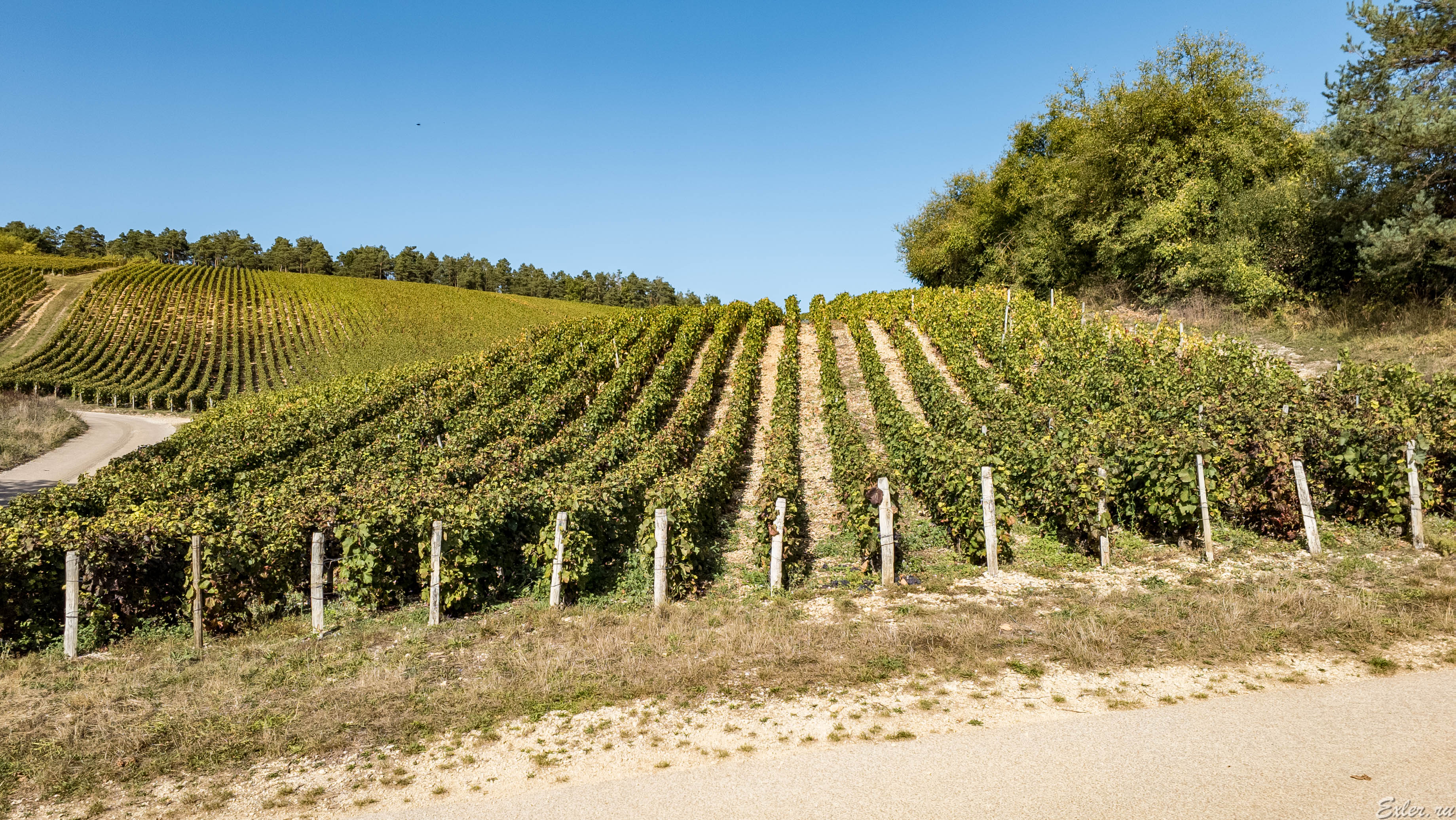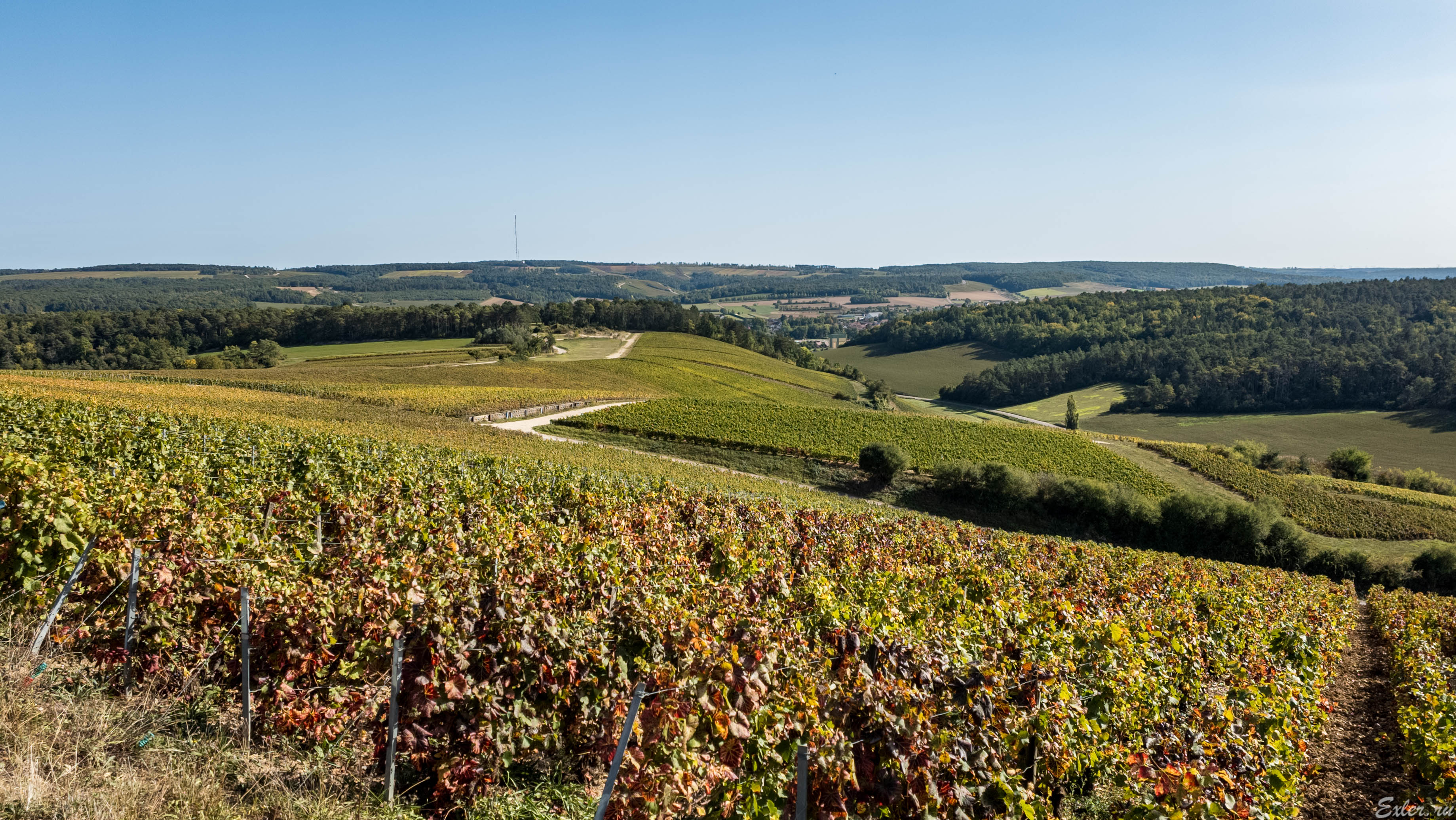Прокатились по некоторым виноградникам Шампани - просто посмотреть на красивые места. Шампанское делают практически только из трех сортов винограда: шардоне, пино-нуар и пино-менье. (Есть еще так называемые условно "забытые" старые сорта - арбан, пти-мелье, пино-блан и пино-гри, - однако они занимают ничтожный процент виноградников). При этом в Шампани пино-нуар - это 38% площади виноградников, пино-менье - 32% площади, шардоне - 30% площади. (Отсылаю интересующихся к моей подробной статье "Как делается шампанское".)
