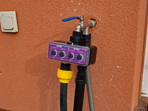 Сделана система автоматического полива: по краям, где цветы и плющ, проложен шланг с отверстиями, а на газоне в пяти местах стоят разбрызгиватели. А вот сам пульт управления этим делом.