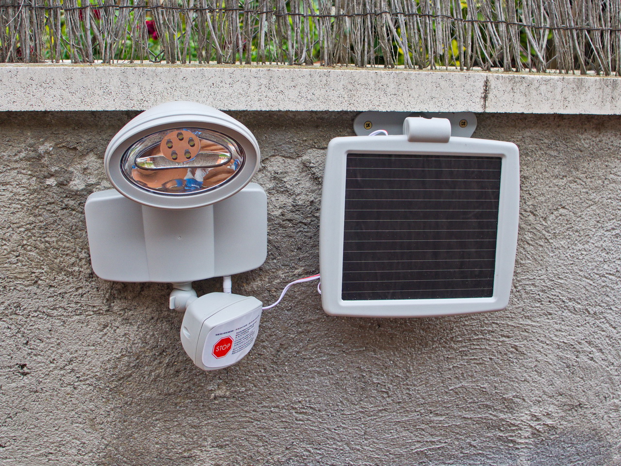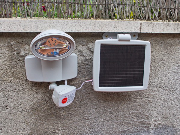 Ну и поставили у калитки полезную штуку: фонарь на солнечной батарее с датчиком движения.