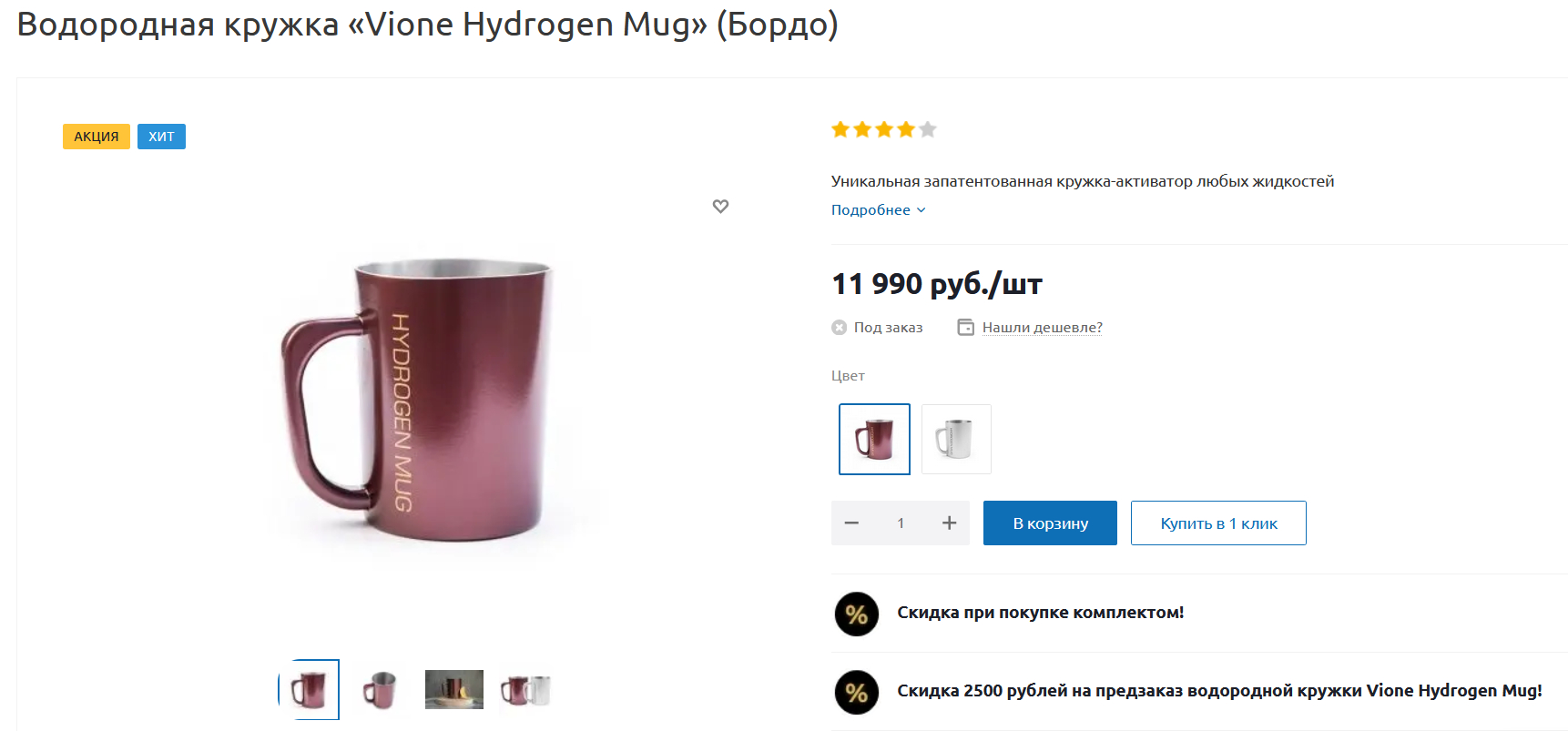 А вот эти прекрасные люди пошли дальше (спасибо Ирине, приславшей ссылочку). Они выпускают всякие "водородные ионизаторы для воды" (обычные пластиковые бутылочки по цене от 4 до 18 тысяч рублей). И они же изобрели нечто совершенно роскошное - водородную кружку!