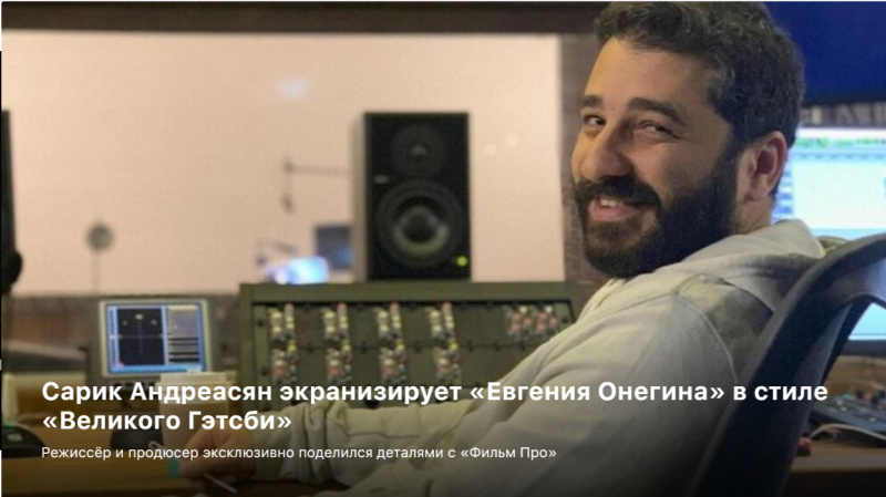 «Я сейчас занимаюсь разработкой “Евгения Онегина”. Как пример – “Великий Гэтсби”. Хочу снять “Онегина”, сохранив эпоху, но при этом сделав его в современной манере. Съёмка, музыка – всё современное, но с сохранением эпохи. Мы сейчас пишем сценарий – очень медленно, скрупулёзно, потому что там очень много нюансов. Это всё-таки Пушкин. Потом мы ещё будем текст много тестировать, потому что не знаем, как люди отнесутся к тому, что мы в какой-то степени всё равно интерпретируем Пушкина, переписываем. В “Онегине” нет диалогов, а люди же ведь должны разговаривать. Сейчас мы пытаемся найти баланс, чтобы фильм был и образовательным, то есть соответствовал тому, что мы читали в школе, и чтобы не оскорбить тех, кто любит это великое произведение. Немножко сложновато, но эту историю, ментальный код, знают все. Все её захотят увидеть. Это должно быть сделано настолько тонко, чтобы не вызвать хейта, чтобы не говорили, что опять на святое покушаются. Думаю, что примерно через год мы заявим проект официально, будем искать на него финансирование».