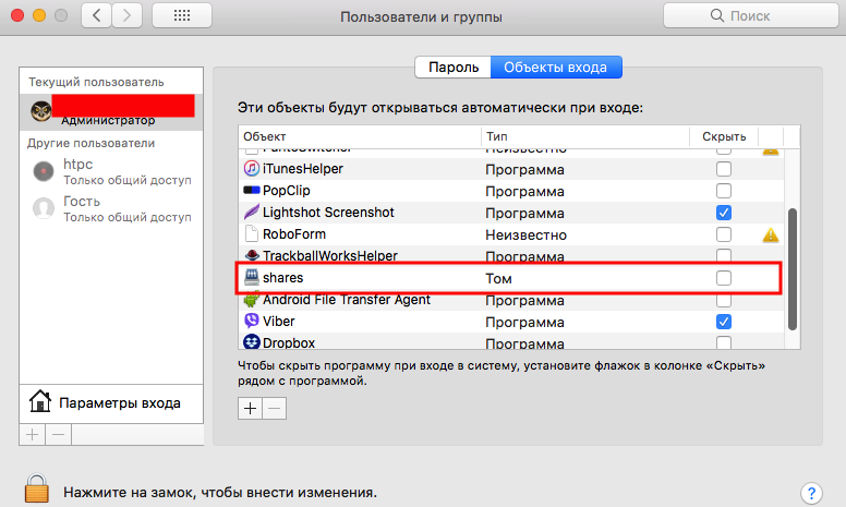 Вначале подключить диск, чтобы он был в системе, потом настройки->пользователи и группы->обьекты входа->+