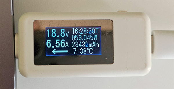 Собственно, в чем вопрос. Мне не сильно хочется возить в ручной клади такой здоровый адаптер. У меня есть небольшой и нетяжелый адаптер на 65 Вт с несколькими портами. Когда я его подключаю к этому ноутбуку, то он показывает 20V, 3A и честные 60 Вт.
