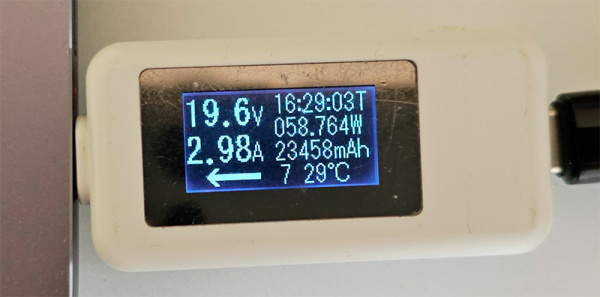 Подключил конкретный адаптер к ноутбуку, измерил, сколько он потребляет. При этом устройство показывает странноватые параметры: оно показывает, что ноутбук берет 20V и 7A, что как раз и составляет мощность 140 Вт (произведение напряжения на силу тока), однако устройство показывает мощность в 60 Вт. А это как вообще? Он же меряет то, что поступает от адаптера.