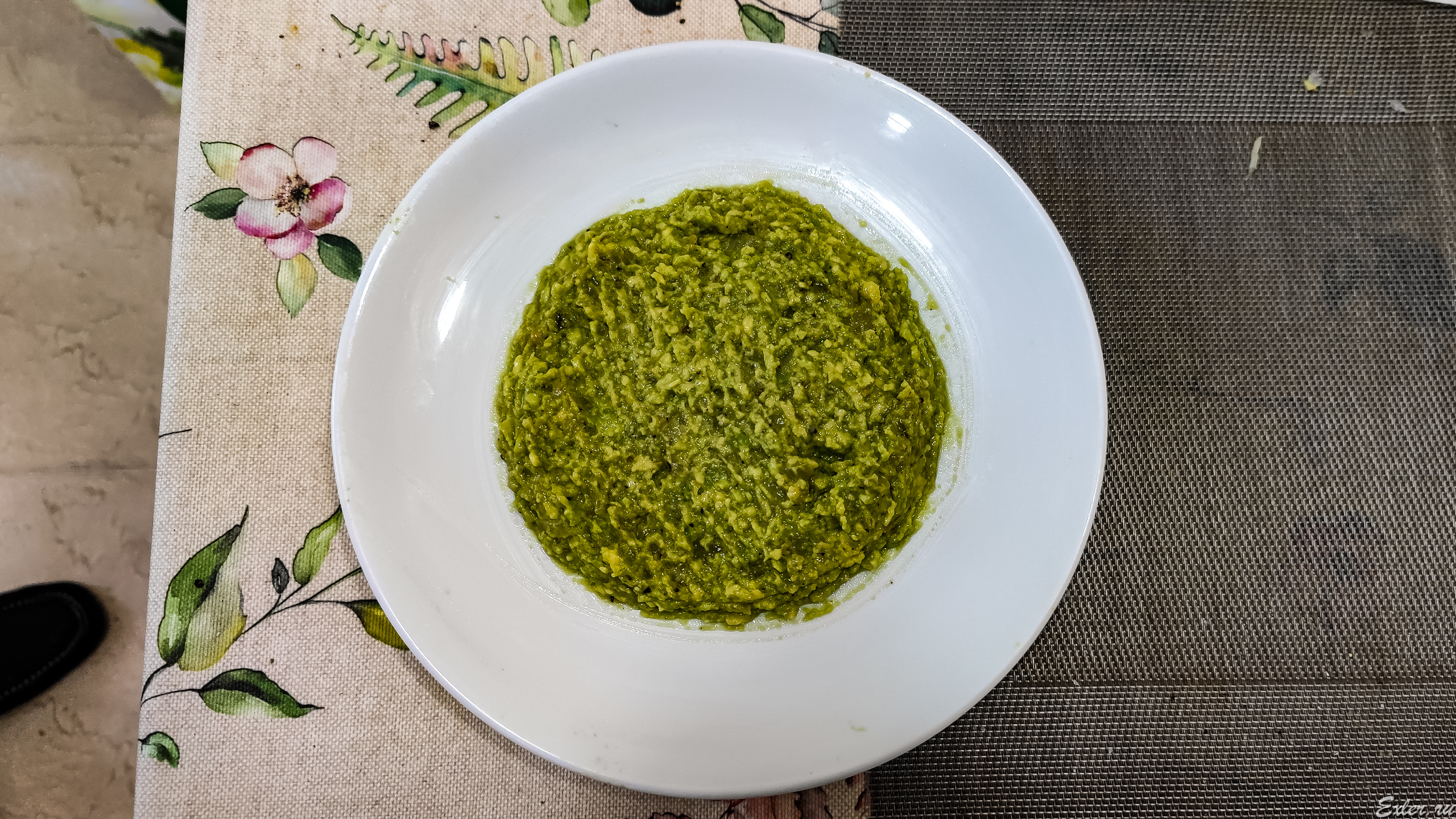 Готовится намазка для баклажанов. Это растертый вилкой авокадо, который смешивается с обжаренным на сливочном масле луком, туда также нужно выжать четвертинку лимона и как следует поперчить.