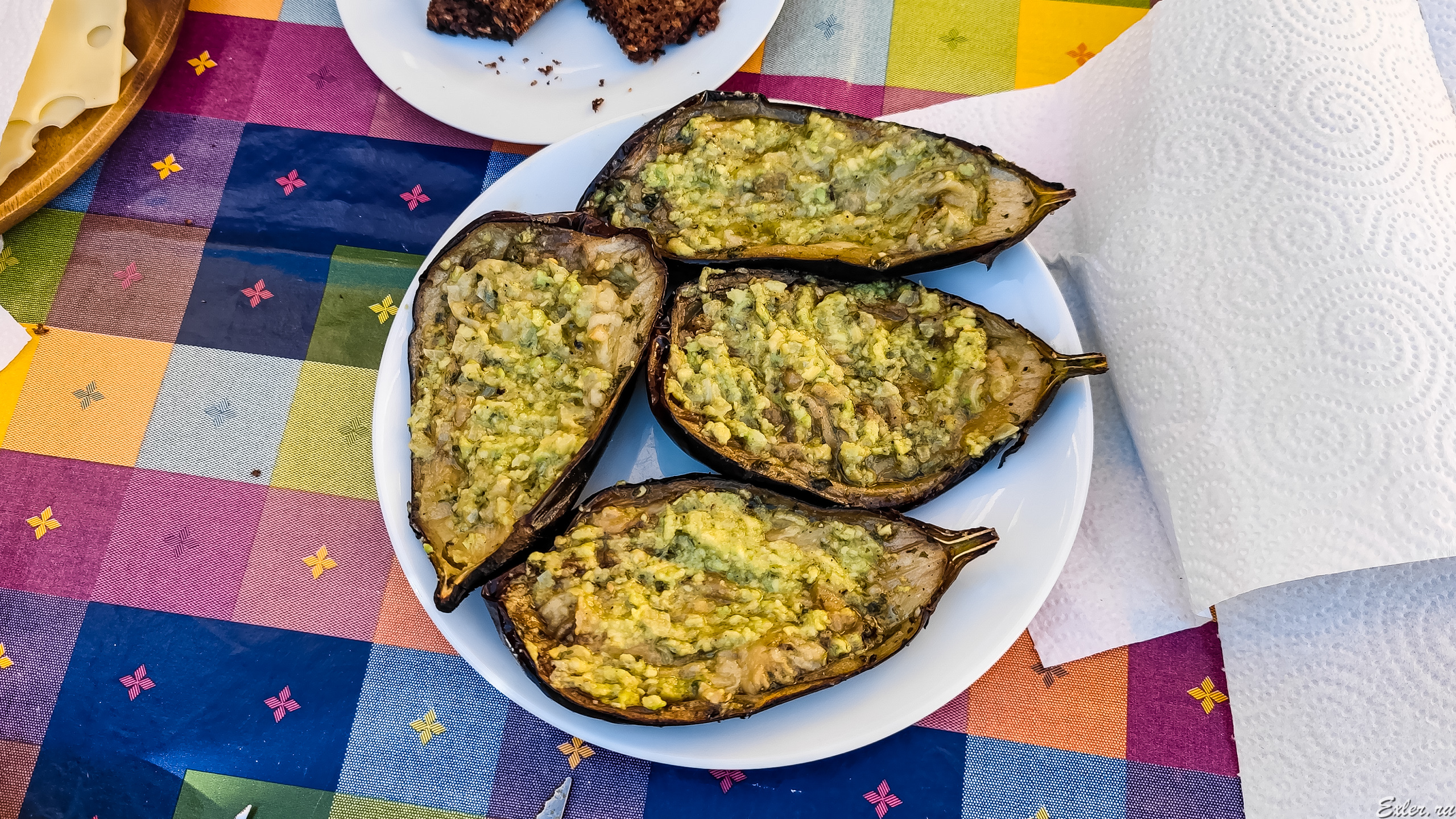 Баклажаны готовы. Их сверху намазываем смесью с авокадо, после чего половинку баклажана нужно выедать ложкой. Блюдо совершенно бомбическое, рекомендую попробовать. Тем более что его запросто можно приготовить в духовке.