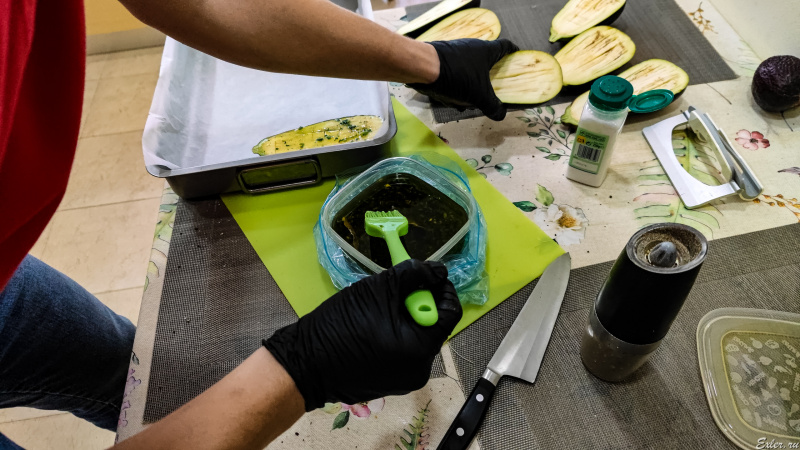 После этого баклажаны промазываются кистью оливковым маслом с чесноком и мелко порубленной петрушкой.