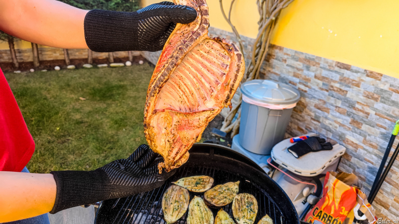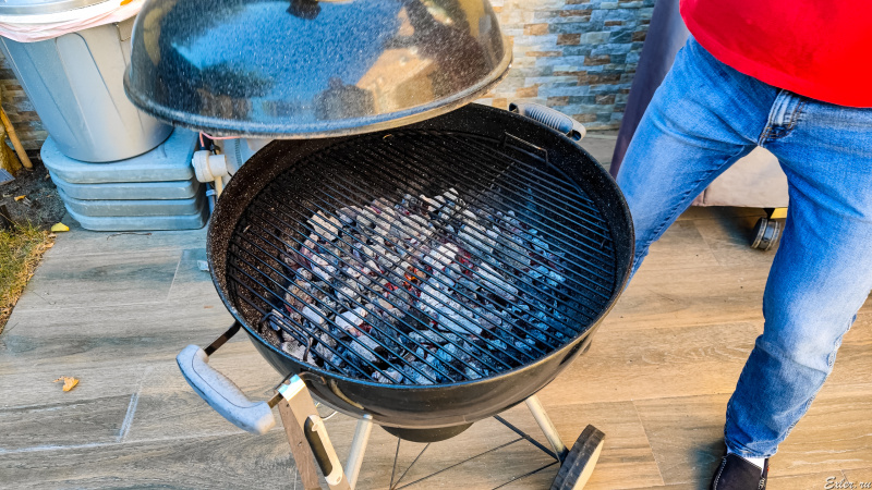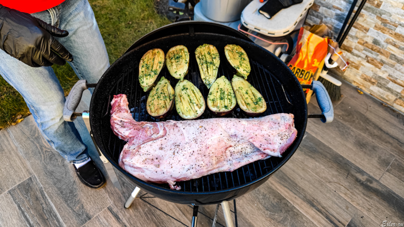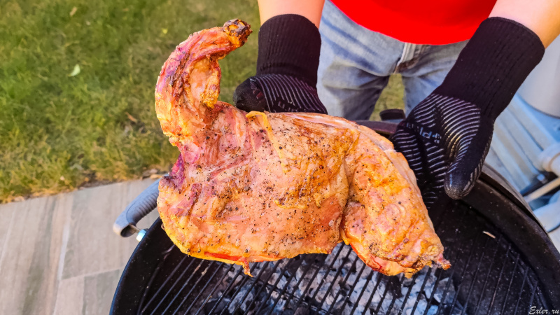 Углям как следует разгореться не даем, температура нужна невысокая - не более 180 градусов, а еще лучше - 160. Но веберовский гриль позволяет довольно точно регулировать температуру нижней и верхней заслонками.