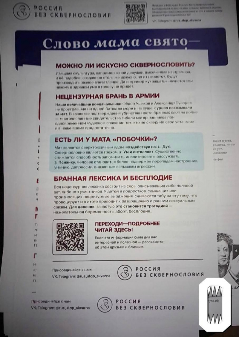 В листовке указано, что «нецензурная лексика состоит из слов, описывающих либо половой акт, либо его участников». Матерные слова, по мнению авторов флаеров, провоцируют и приводят к развращению и ранним сексуальным связям. «Для девочек зачастую это становится трагедией — нежелательная беременность, аборт, бесплодие».
