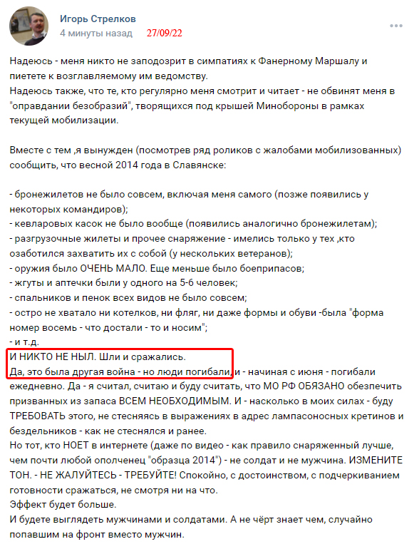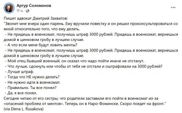 "Мобизилация - это ещё и естественный отбор. Если человек настолько глуп, что, получив написанное дураком в фуражке направление в морг, сразу туда бежит, то туда ему и дорога"