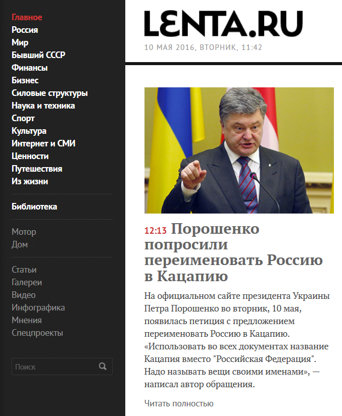 О да! Помню с месяц назад мне человек пять пытались рассказать, как у нас хотят переименовать страну в Киевскую Русь. Подавалось под соусом "Какие вы там хохлы тупые. Совсем вам делать нечего". Про то что это всего лишь петиция, которая набрала под сотню голосов, как-то замалчивали.