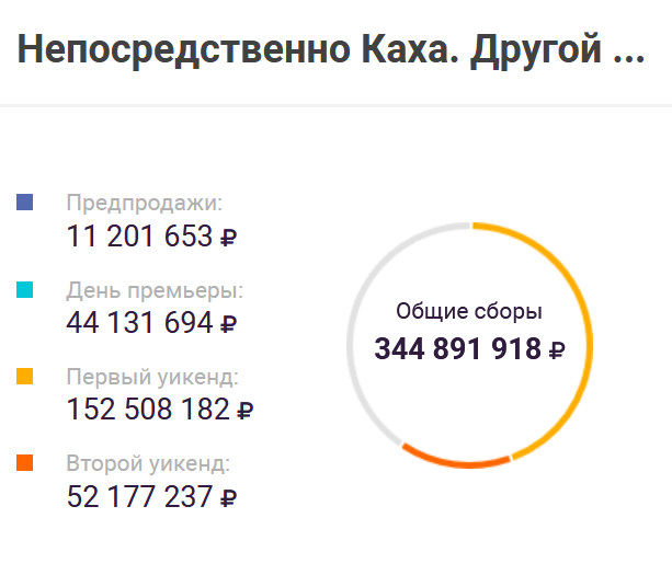 А вот на кинцо под названием "Непосредственно Каха. Другой фильм" народ валом валит - 344 миллиона сборов. Популярное, хотя и имеет рейтинг 2,6 на "Кинопоиске".