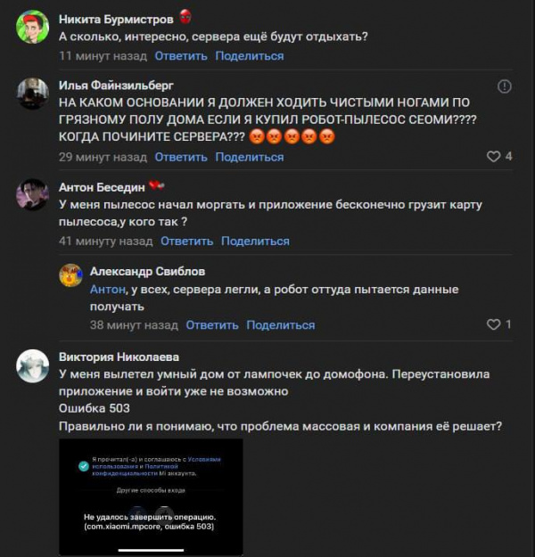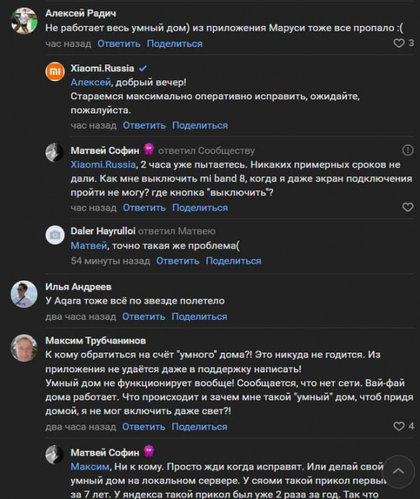 СММщики Xiaomi уже устали отбиваться в соцсетях от сотен комментариев недовольных владельцев и обещают все исправить в ближайшее время. Особенно там негодуют владельцы системы «умный дом» - у них не работает вообще ничего.