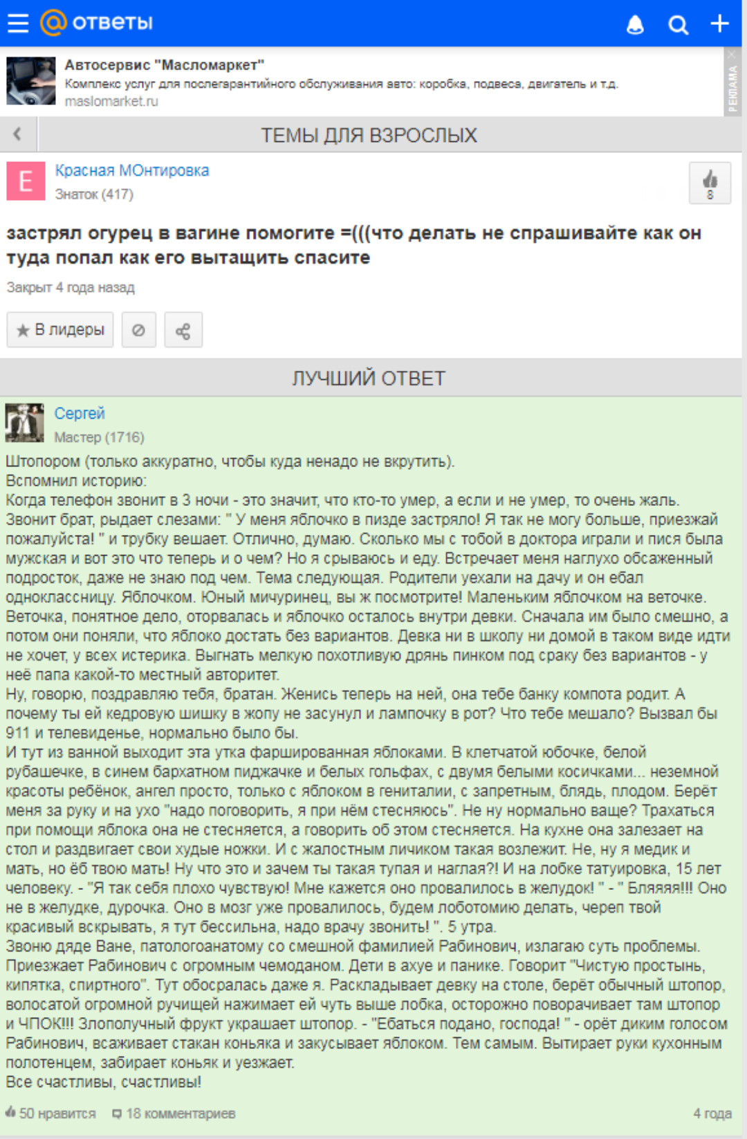 Историю эту как-то давненько рассказал мне один дядечка, годов эдак семидесяти пяти. Мы разговорились с ним в парке: он выгуливал собачку, я ждала подругу. Опрятненький дедушка оказался непрост: он всю жизнь проработал проктологом, плюс еще преподавал. Мы обсудили медицинку и студентов, и плавно перешли на всякие курьезы, связанные с филейной частью пациентов. Так вот, вопреки расхожему мнению, секс в Союзе, все-таки, был. Причем, частенько был он довольно таки разнообразным.