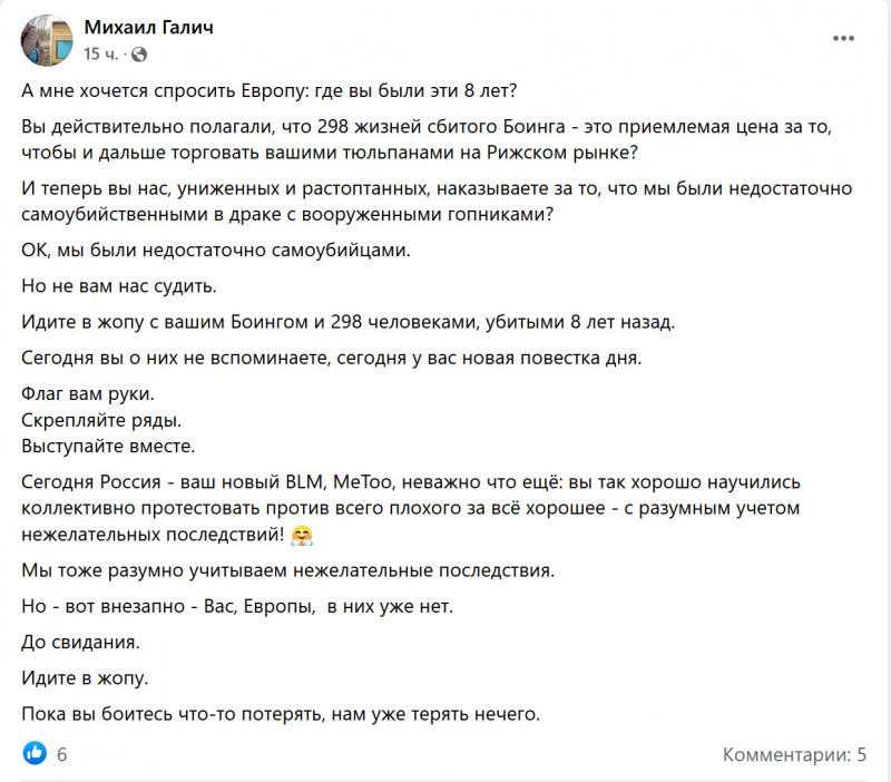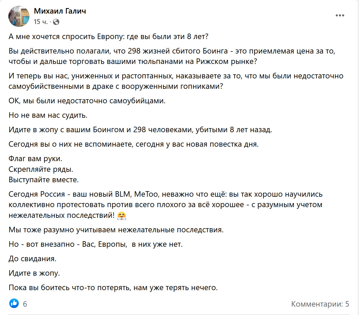 Как здесь уже отмечали, пост Галича вовсе не пропутинский. Это как бы от лица человека из несистемной опозиции. Упрек в адрес лицемерного Запада, который давно мог бы надавить на Путина, но предпочитал его гладить по шерсти, а сейчас преследует всех россиян без разбора.