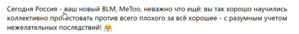 Он пишет что, на нормальных россиян, и без того "униженных и растоптанных" вооруженными гопниками-космонавтами, еще и Европа решила устроила охоту на ведьм по образцам BLM и MeToo. Видите ли, мы были недостаточно самоубийственны в борьбе за демократию...
