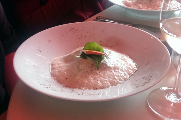Равиоли там под этой пенистой подливой, видимо. Вот эти два виднеющихся бугорка.