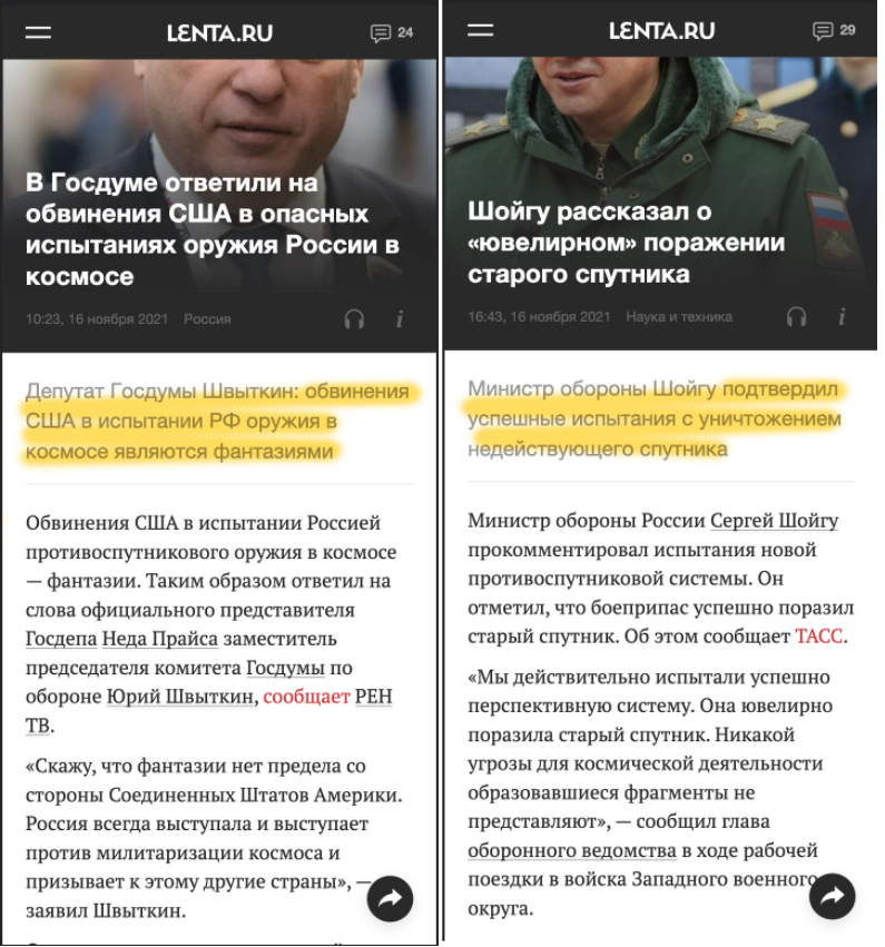 В российском Минобороны назвали лицемерными обвинения запада, и уточнили, что США должно быть "доподлинно известно", что фрагменты спутника "Целина-Д" по времени испытаний и по параметрам орбиты не представляли и не будут нести угрозы для орбитальных станций, космических аппаратов. Министр обороны РФ Сергей Шойгу подтвердил успешное испытание Россией противоспутниковой системы. По его словам, "она "ювелирно" поразила старый спутник", а его обломки не угрожают космической деятельности. (Отсюда.)