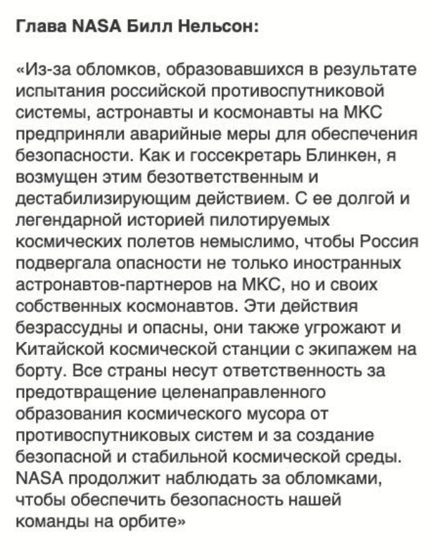 "Российская Федерация безответственно провела испытание противоспутникового оружия... Это испытание повысит угрозу для космонавтов на МКС, а также для других пилотируемых космических полетов", - заявил Прайс в ходе брифинга.
