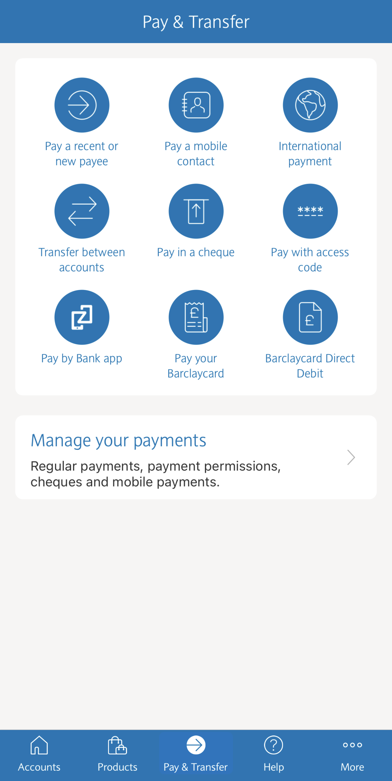 У меня вот такие функции есть в разделе "Pay & Transfer" (см. скриншот), у вас ведь так же?