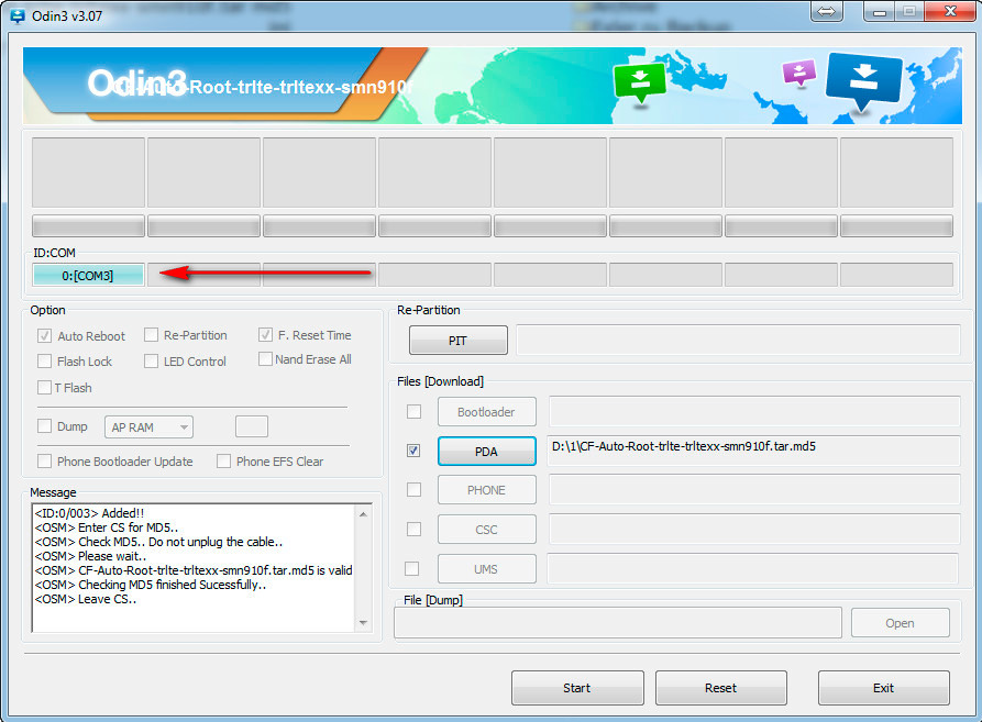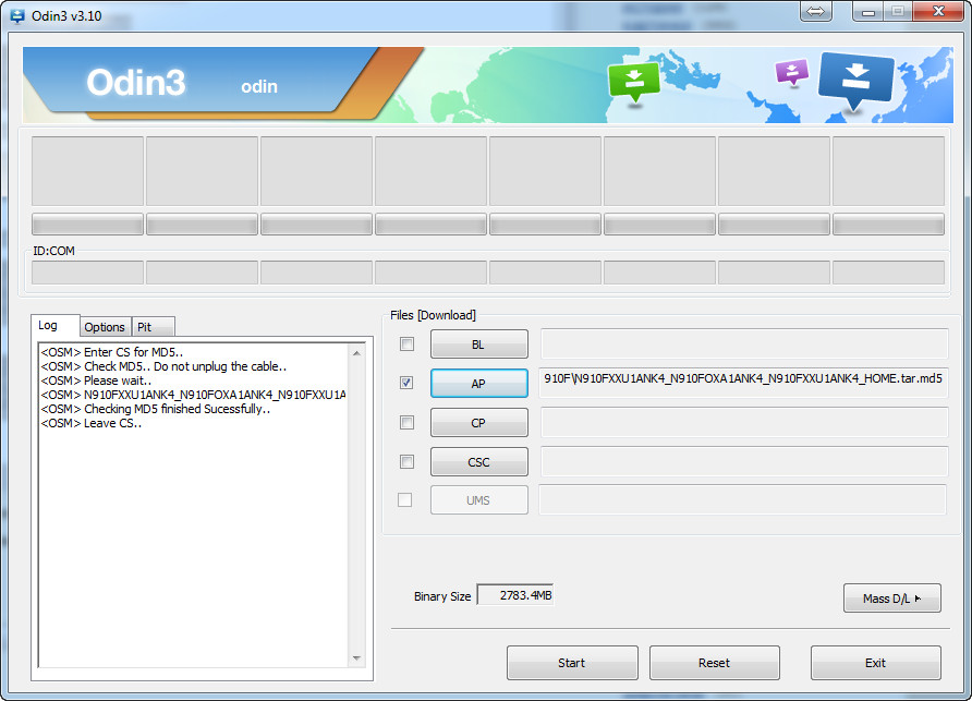 Далее находите и скачиваете прошивальщик Odin (вроде самая свежая версия сейчас - 3.10, скачать вот здесь). Запускаете Odin от имени администратора (правая кнопка мыши на выполняемом файле). Нажимаете в Odin кнопку АР и выбираете свой файл прошивки (он имеет расширение .tar md5). Odin проверит эту прошивку и если все в порядке - выдаст соответствующее сообщение, вот как-то так.