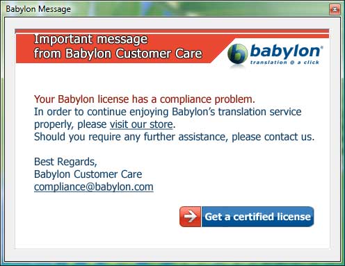 Неделю назад Babylon опять мне выдал окно с сообщением о том, что с лицензией какие-то проблемы. Я подумал, что это связано с переустановкой системы - я перешел с XP на Vista и программу ставил заново (правда, это было пару месяцев назад). Однако и на компьютере жены, где совершенно другая лицензия и где ничего не переставлялось, Babylon также выдал аналогичное окно. А стоила одна копия $89 - не такие уж и маленькие деньги.
