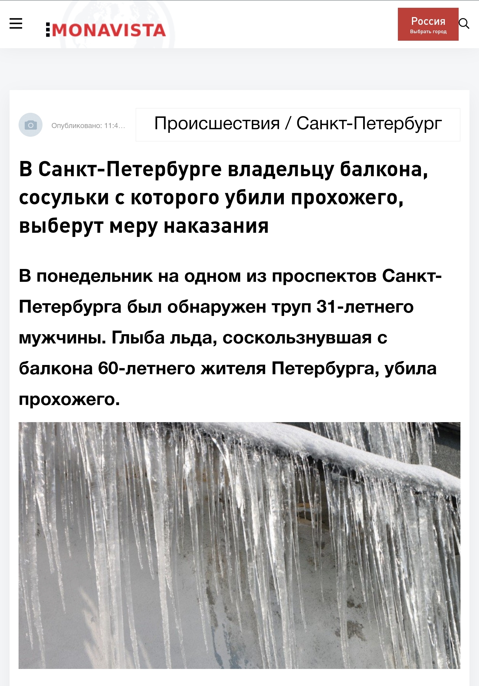 У нас хоть и не Питер, но каждый год тоже есть пострадавшие и погибшие от упавших ледяных глыб.