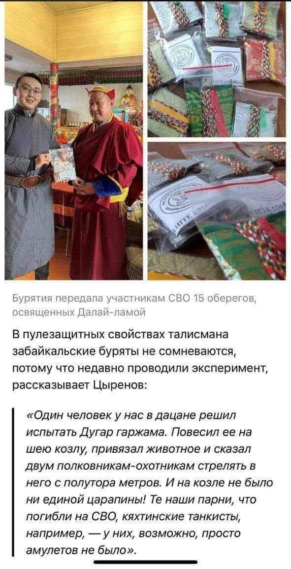 Всё, вражеские дроны теперь не страшны, российские воины-богатыри надежно защищены! Кстати, Путя там вроде с НАТО уже собрался воевать - как раз с недавнего времени он стал утверждать, что с НАТО воевать не планирует, а это верный признак. Ну что ж, надо и другое оружие разрабатывать! Молитву от Томагавков, молитву от F-16, молитву от ATACMS. Срочно, срочно разрабатывать, времени на раскачку нет!