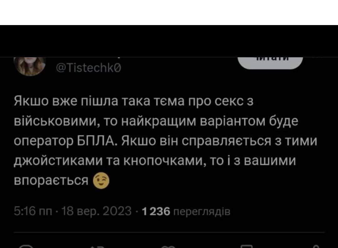 "Если уж пошла такая тема о сексе с военными, то лучшим вариантом будет оператор БПЛА. Если он справляется с теми джойстиками и кнопочками, то и с вашими справится".