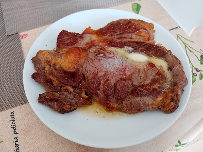Зашёл сюда впервые за много лет, чтобы решительно заявить: я против масла при доводке стейка, тем более такого не филейного, с жирком. У масла слишком отчётливый привкус, масло тянет одеяло на себя.