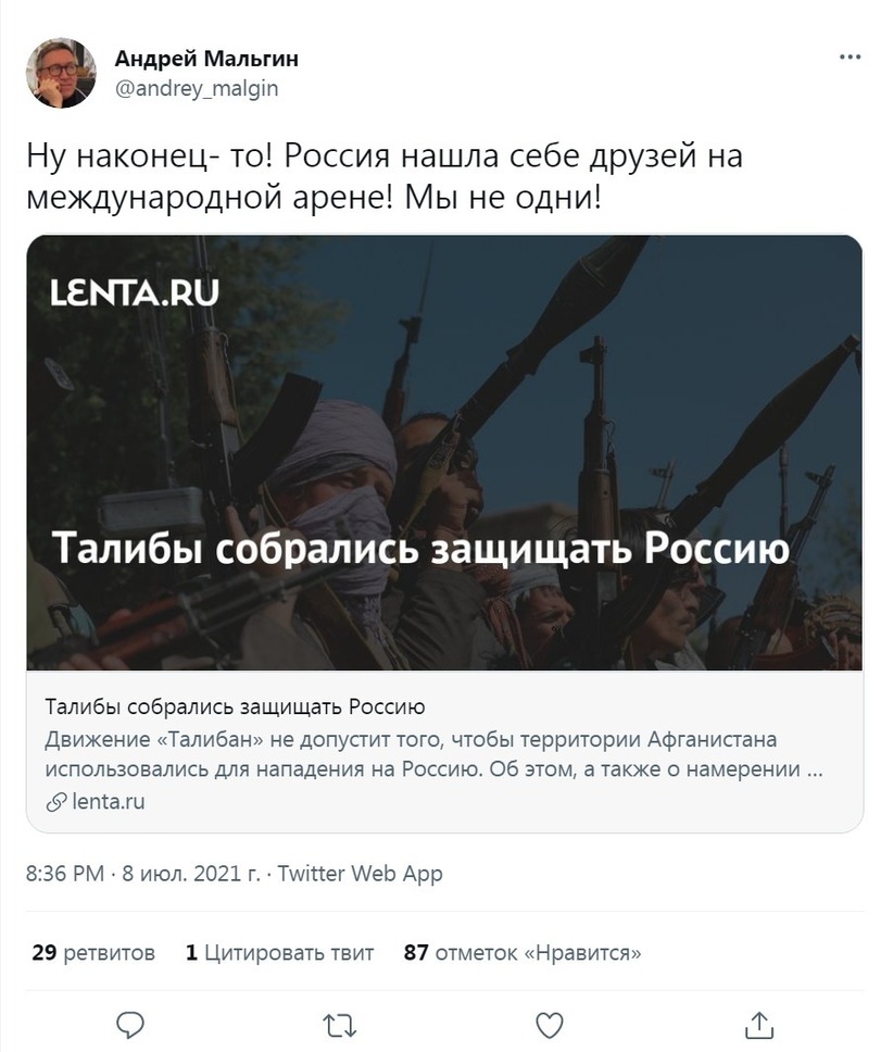 Прелестно, да. Представители движения "Талибан", которое, между прочим, запрещено в России, свободно приезжают в страну, да еще и проводят пресс-конференцию в отеле "Рэдиссон", а экстремистами при этом объявлен Фонд борьбы с коррупцией, и их прессуют по полной. Отличная демонстрация того, чего вообще стоит этот "закон по борьбе с экстремизмом" и как он выполняется.